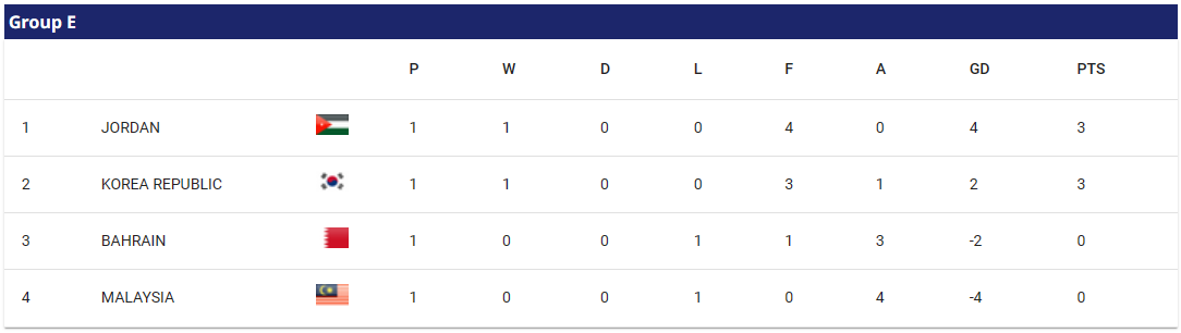 한국이 속한 E조 순위를 살펴보면 팀당 1경기를 치른 현재 요르단이 1위, 한국이 2위, 바레인과 말레이시아가 각각 3위와 4위를 유지하고 있습니다.