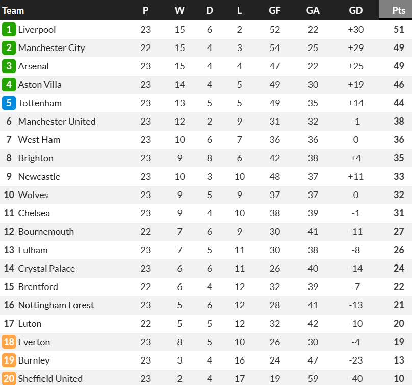 23라운드까지 진행된 현재 프리미어리그 순위를 살펴보면 다음과 같습니다.