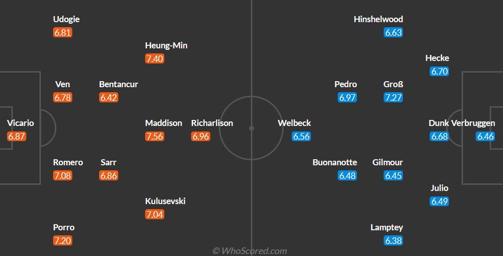 토트넘과 브라이탄의 전력을 비교해 보면, 제임스 메디슨을 중심으로 손흥민(12골 5도움)과 히샬리송(10골 3 도움)의 활약이 눈부시기 때문에 공격적인 측면에서 브라이튼에 앞서있습니다.